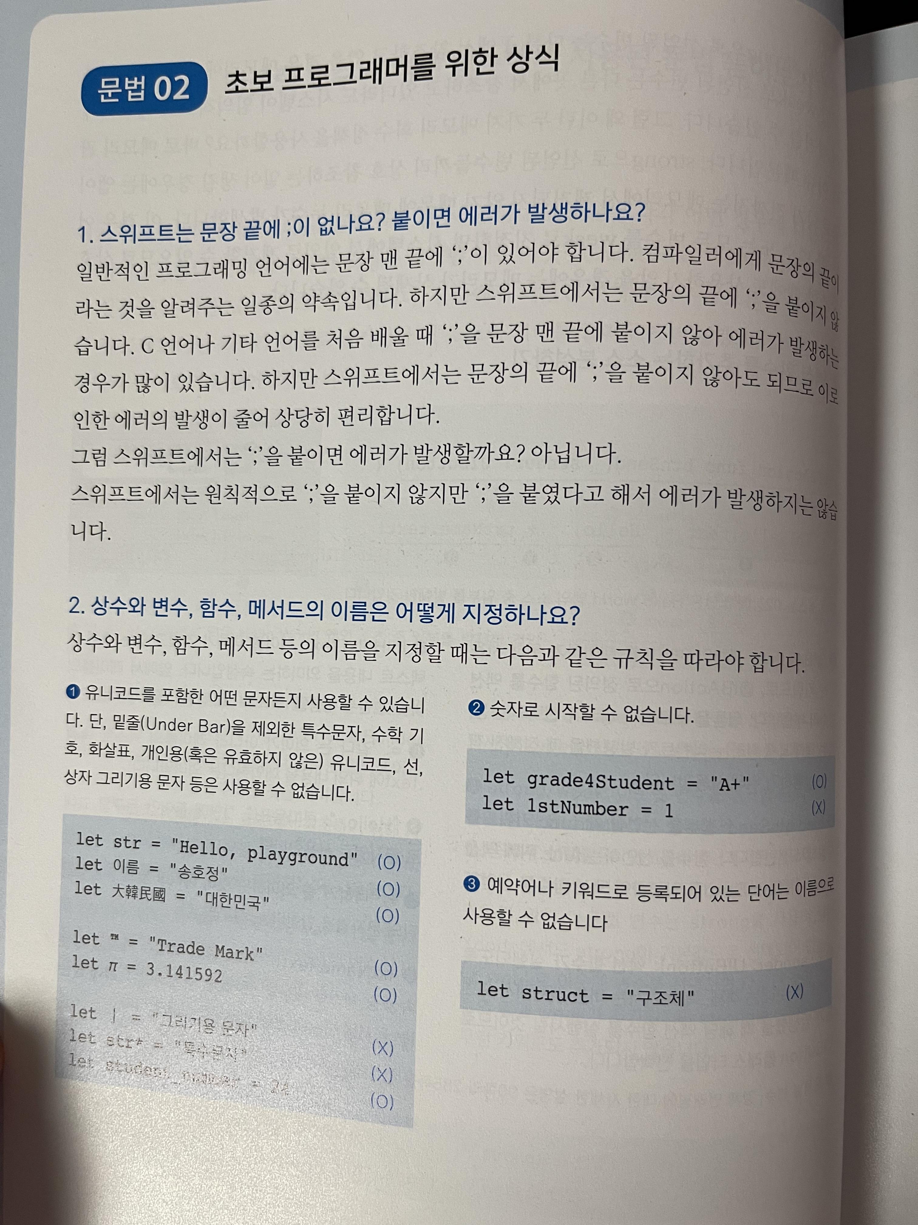 구성이 친절한 것은 당연한 것이지만 보통 ios앱 개발 같은 것은 완전한 코딩 초보자까지 배려하기가 쉽진 않은데 이 책에서는 처음 코딩을 배울 때에도 배울 수 있게 하는 것이 목표였는지 변수와 상수, 변수명 이름을 짓는 방법부터 시작해서 아래와 같이 초보 프로그래머를 위한 상식이라는 페이지에 자잘한 상식들을 잘 넣어주는 것을 확인할 수 있었습니다.